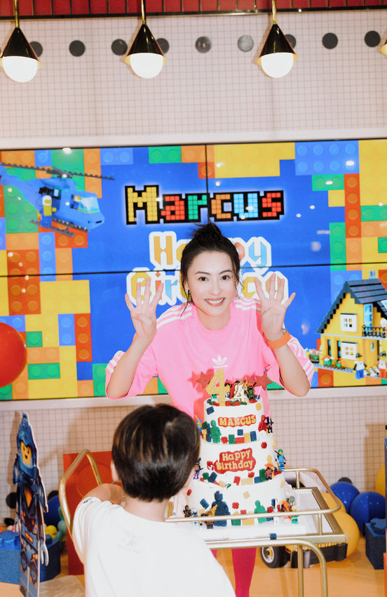 张柏芝晒照为小儿子Marcus庆生。画面中,张柏芝身穿粉色休闲宽版T恤,下身着玫粉色紧身裤袜,既休闲时髦,又有青春减龄的效果,搭配简单的丸子头更平添了几分清新靓丽感。现场布置色彩丰富,童趣感满满,张柏芝冲镜头伸出四根手指以示这是儿子的四岁生日,温柔笑容更是传达了满满的幸福感。