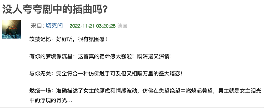 陈筱舒:《不期而至》的闫宇彤导演对于创作是非常精益求精的,在这部剧里,有很多段落我们都用了电影的对点写法。国内电视剧的集数相对国外剧集都更长些,所以音乐的量很大。制片人唐海岩老师也非常在意制作的品质,创作的量大也意味着后期音乐制作的量也非常大。一百多分钟的配乐和四首歌的创作压力让我在几个月内长胖了十多斤。后期的制作我们也尽量保持了好莱坞工业化制作流程,全部的配乐录音都由布达佩斯电影交响乐团和美国两位提琴手联合录制。制谱,装订,混音等等一步都不少,也辛苦了后期音乐组的小伙伴们。第一次交给导演的是配乐的主题,歌曲《有你的梦境像流星》和《软禁记忆》,大家一致很喜欢。后面的两首歌《燃烧一场》和《与你无关》的旋律跟导演磨合了一阵子。观众的喜好是很主观的,但创作者的心一定要非常真诚。《不期而至》是可以刷很多次的剧,希望大家能喜欢。