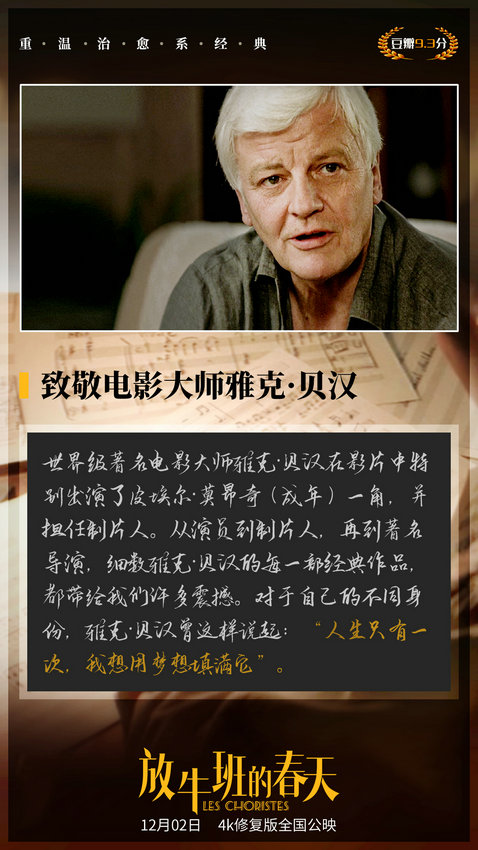 世界级著名电影大师雅克·贝汉在影片中特别出演了皮埃尔·莫昂奇一角,同时还担任了制片人,其电影作品制作精良,在国内有着良好的口碑。他的作品《海洋》、《地球四季》等影片在国内公映后都获得巨大成功。从演员到制片人,再到著名导演,细数雅克·贝汉的每一部经典作品,都带给我们许多震撼。很多资深影迷在大银幕上看见他的出现都十分动容:“没有想到还能在影院看见贝老,真的很想念他”。而此次电影《放牛班的春天》全国公映也有着重大意义,这或许是这位电影大师在国内上映的最后一部作品。
