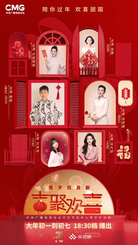 中央广播电视总台文艺中心首档贺岁栏目剧《吉聚欢喜》将从大年初一到初七在中央电视台综艺频道18:30档播出,六位主持人杨帆、张蕾、月亮姐姐、王冰冰、马凡舒和张舒越相约齐献“演员首秀”,用七部生活轻喜剧,串联出万千家庭蓬勃锐气的年味故事,烘托出当代中国醇厚馨香的欢乐节庆。
