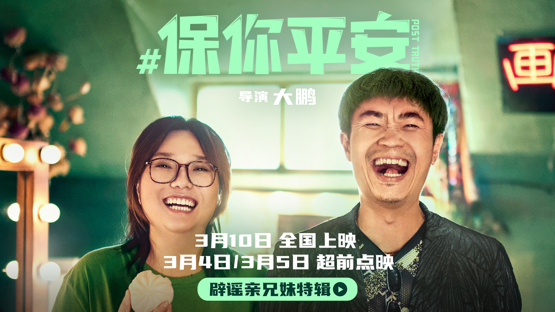 由大鹏执导,苏彪、大鹏编剧,陈祉希担任总制片人,大鹏、李雪琴、尹正、王迅、王圣迪领衔主演,马丽特邀友情出演,宋茜、白宇特邀出演,贾冰、杨迪、潘斌龙、倪虹洁主演,乔杉、于洋、刘金山、曹炳琨、梁超友情客串的电影《保你平安》将于3月10日全国上映。日前,电影《保你平安》发布了“辟谣亲兄妹”特辑,片场中导演大鹏赞李雪琴“十分优秀,演得很好,很乐观”,李雪琴说大鹏“有当兄长的那种天然的责任感”,二人合作默契十足,现场欢乐融洽,尽显影片喜剧格调。