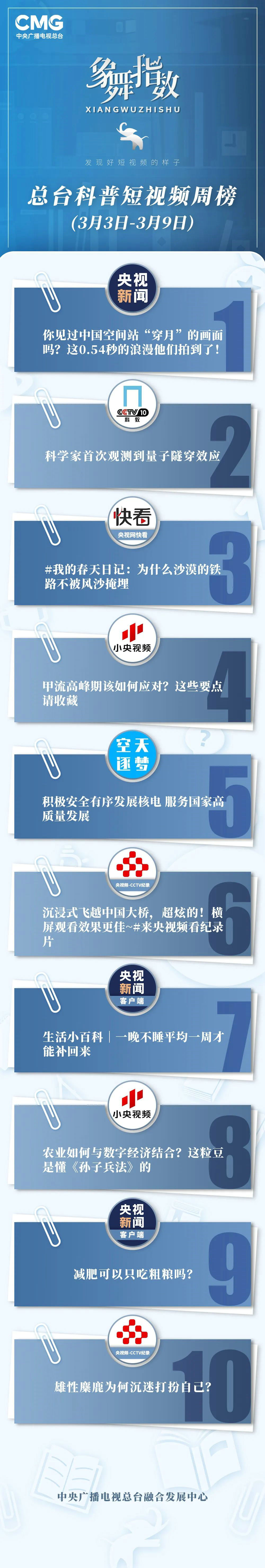 中央广播电视总台“象舞指数”评议品牌,推出科普短视频周榜、总台科普短视频周榜。在2023年3月3日—3月9日,值得注目的内容有:清华大学博士生张嘉奇等人拍下中国空间