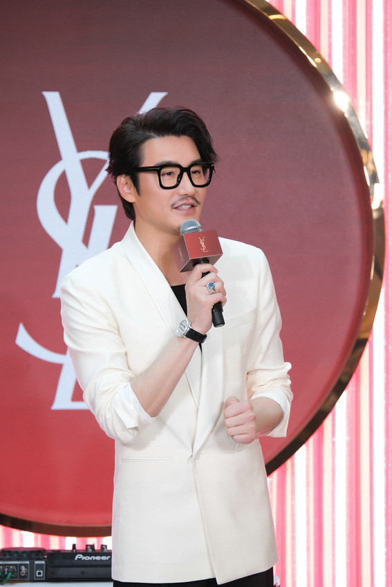 活动分为两日进行,首日,胡兵着一身黑色西装参与品牌分享会,微微挽起的袖子体现出随性休闲的感觉,但举手投足间又尽显精英气质。活动次日,胡兵身着白色修身西装外套搭配黑色内搭,经典时尚的黑白造型以体现出高级的气场,与红色美学构筑起奢华美妆快闪店相得益彰。