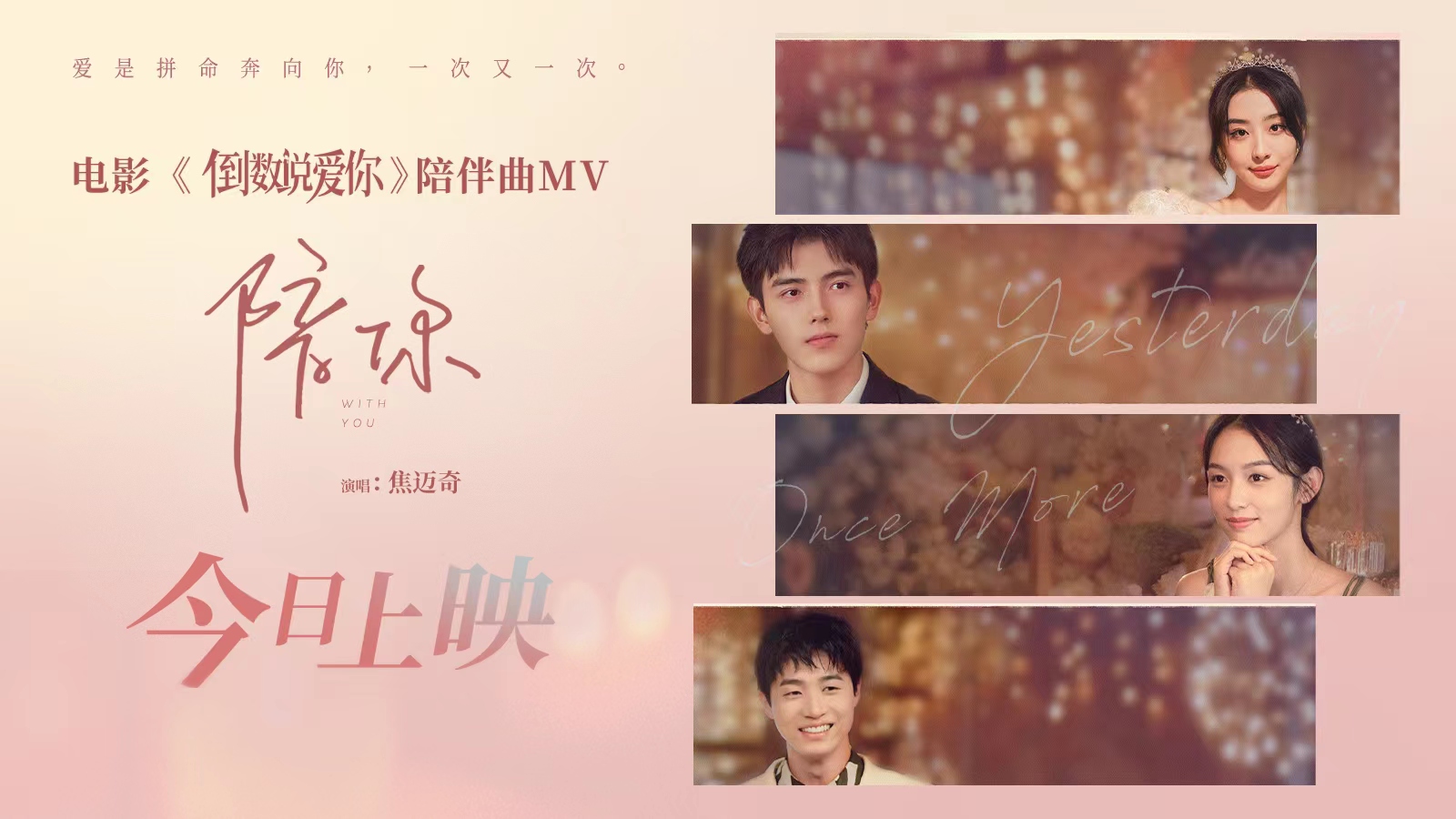 由林孝谦执导,陈飞宇、周也领衔主演,赵小棠、孙天宇主演的爱情电影《倒数说爱你》今日浪漫上映,同时发布了电影插曲《陪你》MV与上映海报,插曲由导演林孝谦作词,魏诗泉作曲,陈建骐担任制作人,青年歌手焦迈奇温柔演绎。少年清澈的嗓音唱出了在爱情中对未来和爱人的坚定守护,也表达了两个相爱之人想要陪伴彼此,共同探索美好未来的愿景,轻快的曲调和深情的歌词完美演绎了谷雨轩、韩书妍的情感历程。MV中两人约会、旅行、分享喜悦、分担忧愁、许下诺言,每个场景都记录了他们幸福的小日常,甜蜜氛围直接溢满整个屏幕。在上映海报中,谷雨轩和韩书妍、Olivia和Teddy,仿佛都深情望向自己深爱的人,眼神里都透露着对幸福和美好向往。电影于今日正式公映,以电影六大看点带你走进坚定守护、双向奔赴的甜蜜爱情,解锁五一约会指南,一定要约上心动的人来影院,共同见证幸福圆满!