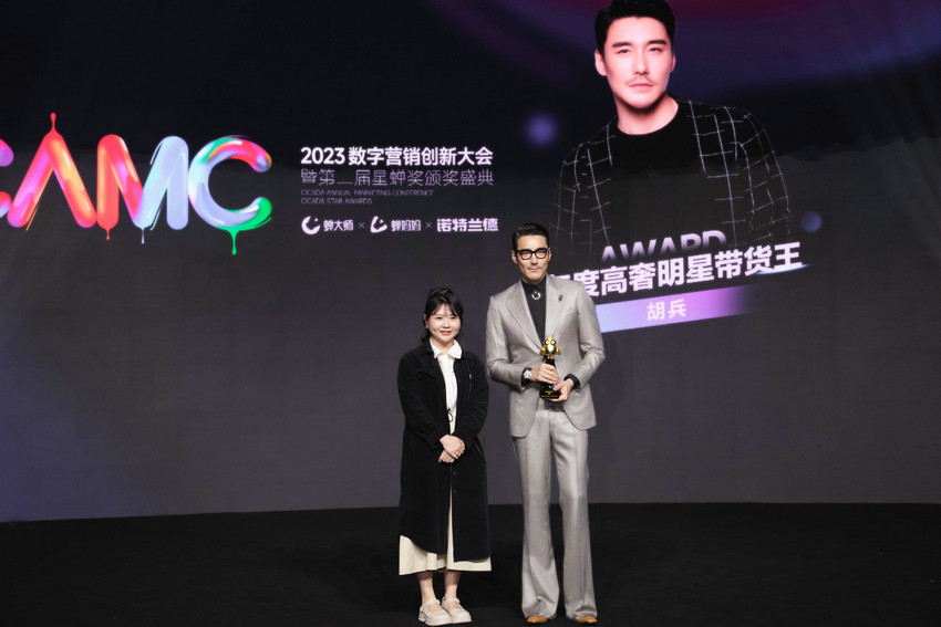 4月28日,胡兵在2023蝉妈妈数字营销创新大会荣获“年度高奢明星带货王”奖项,颁奖时,胡兵身着灰色西装,搭配黑框眼镜,以一贯精致的绅士形象出席大会。
