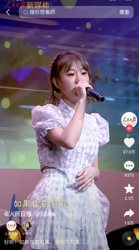 6月1日晚,由《人民日报》新媒体举办的“回到小时候”主题六一歌会在各大社交、视频平台同步直播,晚会邀请谷建芬、黄雅莉、小阿七、清华大学阿卡贝拉社等嘉宾演唱经典儿童歌曲及动画片主题曲。其中,YY直播旗下艺人小阿七携最新歌曲《如果你要写风就别只写风》倾情献唱,该节目片段经人民日报官方抖音号与小阿七个人账号共同发布后,迅速登上抖音热榜,点赞量超27万。