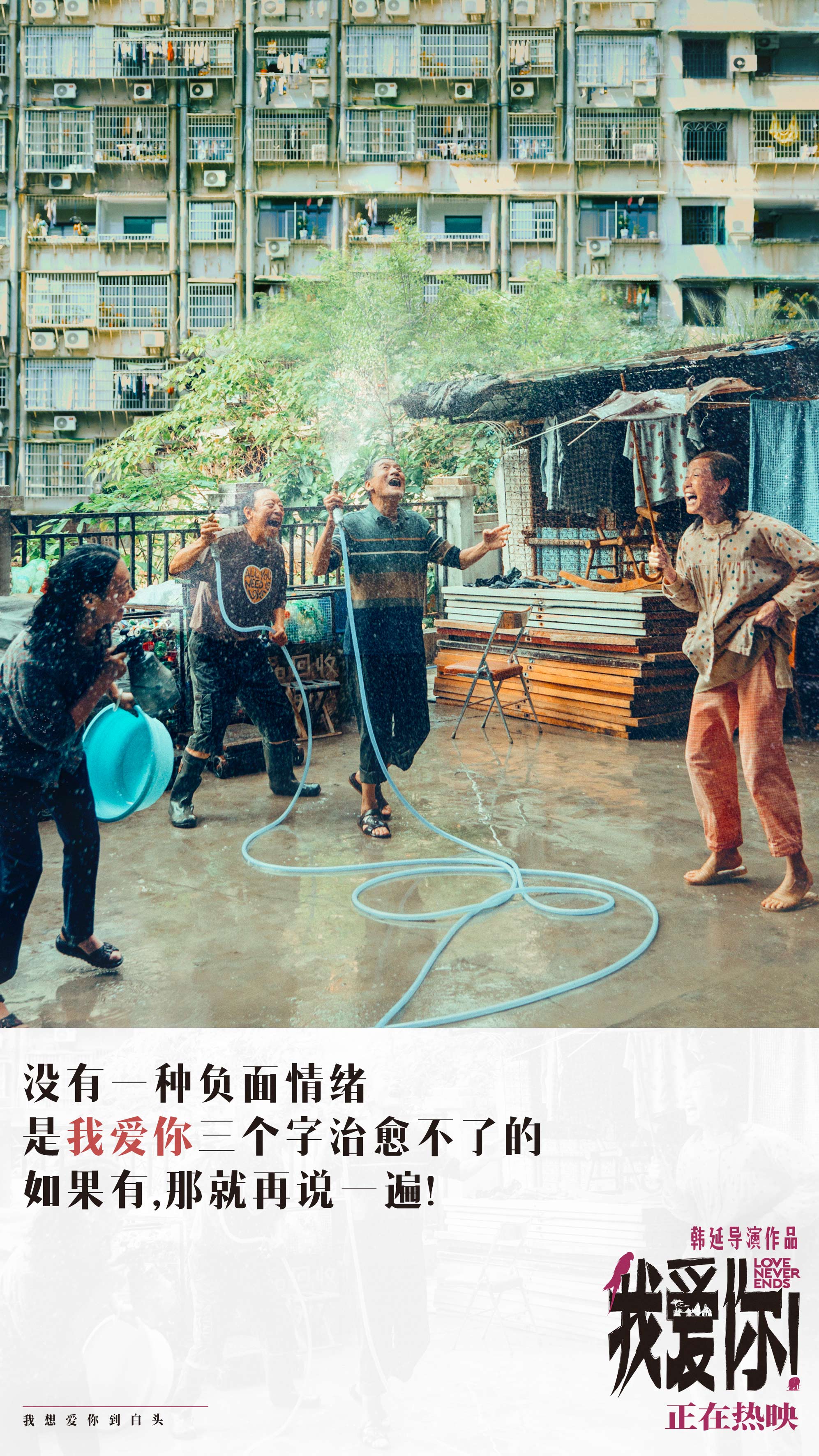 今日释出的台词剧照中,最具感染力的则莫过于那句“没有一种负面情绪,是我爱你三个字治愈不了的,如果有,那就再说一遍”,画面中四位灵魂受过伤的老人在城市一隅尽情嬉水玩闹,抱团取暖、相互治愈,破旧的庭院、清贫的生活却依旧没能阻挡他们热爱生活、彼此相爱的勇气,好似能将这份暖愈传递,浸润至我们每个人的心间。